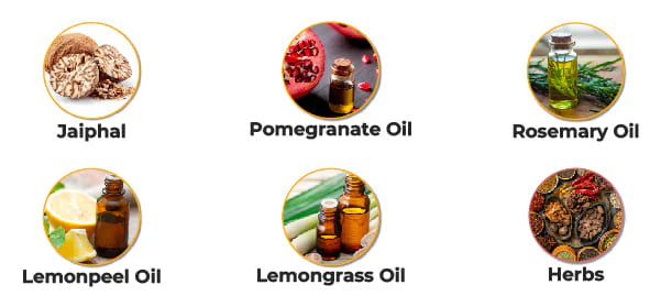 Jaiphal, Pomegranate Oil, Lemonpeel oil, Lemongrass Oil, Rosemary Oil & some secret herbs, gel base